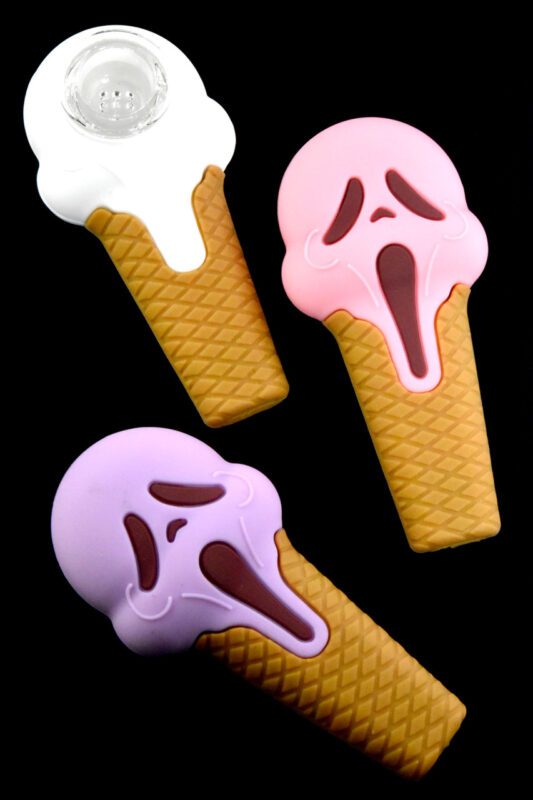 Colorful silicone spooky ice cream pipe with glass screen bowl. Colors will vary.